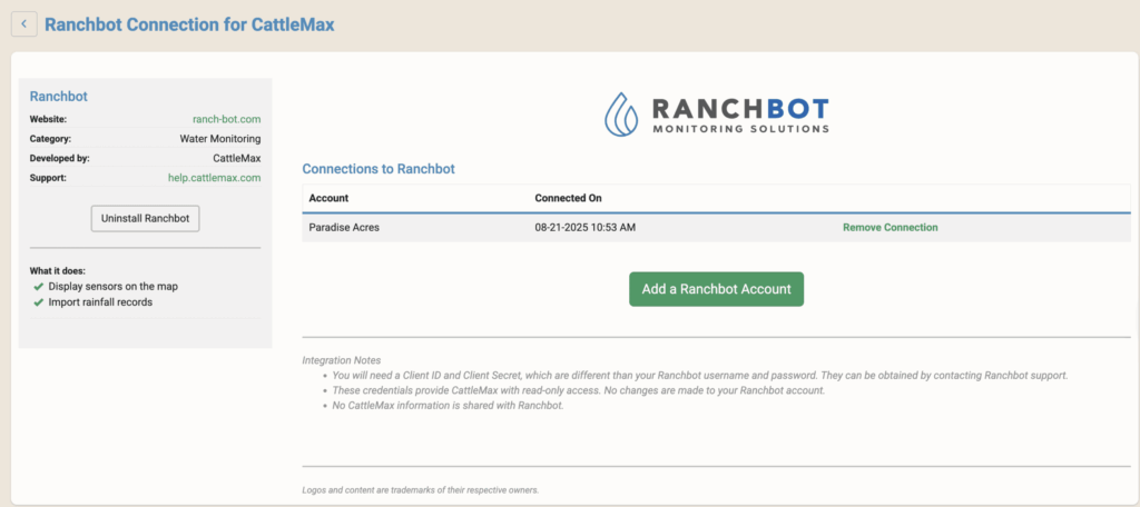 Go to Settings > Partner Integrations in CattleMax, then use your Ranchbot Client ID and Client Secret to connect your sensors and start viewing their data.