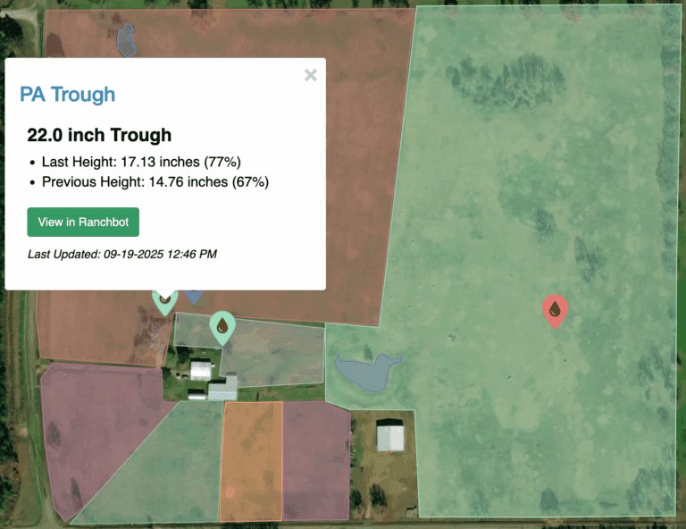 Real-Time Pasture Insights: View current water levels and 24-hour rainfall totals at a glance, with quick links to detailed sensor data in your Ranchbot account.